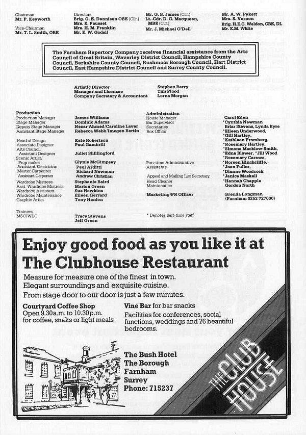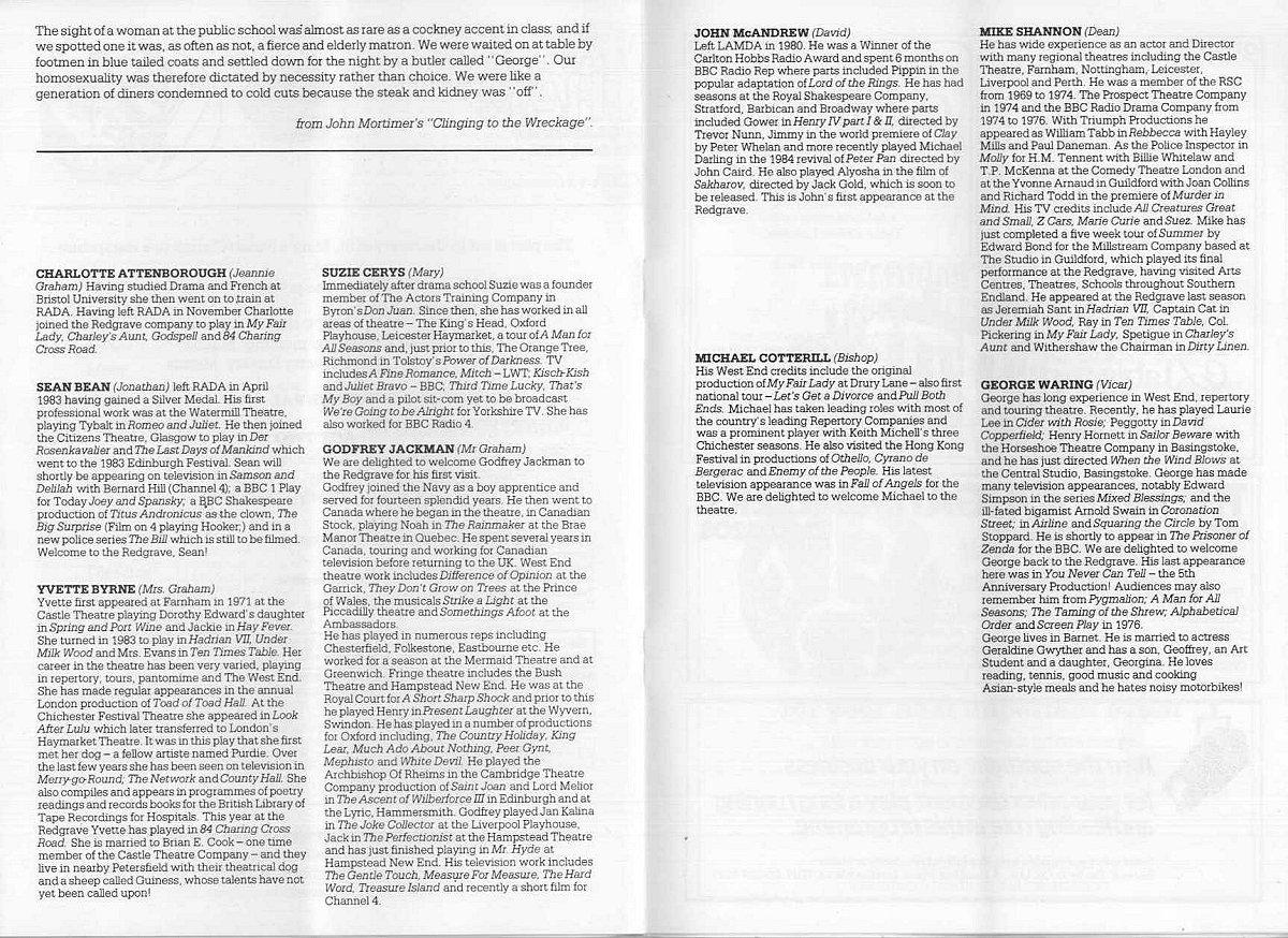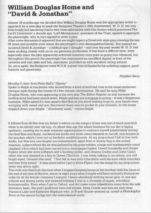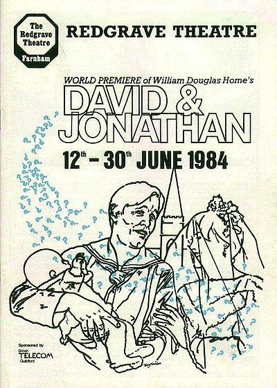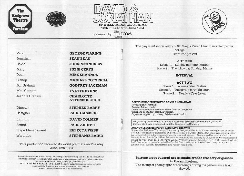 The play is set in the vestry of St. Mary's Parish Church in a Hampshire village. Time: The Present THE REDGRAVE THEATRE (FARNHAM) 12 JUNE - 30 JUNE 1984 DAVID AND JONATHAN A play by William Douglas-Home George Waring............Vicar Sean Bean................Jonathan John McAndrew............David Suzie Cerys..............Mary Mike Shannon.............Dean Michael Cotterill........Bishop Godfrey Jackman..........Mr. Graham Yvette Byrne.............Mrs. Graham Charlotte Attenborough...Jeannie Graham Director.................Stephen Barry Designer.................Paul Gambrill Lighting.................David Colmer Sound....................Paul Arditti Stage Management.........Rebecca Webb Wardrobe.................Stephanie Baird This production received its World Premiere on Tuesday, June 12, 1984.