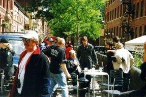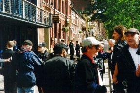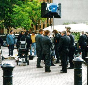 So what is Extremely Dangerous all about? Judging by this morning's action, it's about Sean Bean, wearing green overalls, a purple shirt and workboots, fiddling about with some electrical wiring under the road, then sauntering over to an outdoor café to have a word with Ron Donachie, who is sitting at a table having a quiet drink. Which is where the Range Rover with the spotless windshield comes in. As Sean's character (Neil Byrne) and Donachie's character (Gebbert) chat, the Range Rover drives ominously down the road towards them. Gebbert utters a threat: "You're a dead man, Byrne!" - then gets up and walks away. The Range Rover screeches to a stop. A number of evil looking men leap out, only to be dispatched by Sean - a car door slammed in the face of one, a wine bottle shattered over the head of another. It is, as films go, one very long scene, and an extremely technical one at that. Timing is everything. |