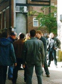 Today's spectators are by and large curious office workers who inhabit the general vicinity of the Manchester's gay district, which we are smack in the middle of. But because the action is moving away from Canal Street and off into a smaller, darker side road, the security at both ends has been relaxed. People stroll down the street on their way to the pub, stop at the elevated camera tracks and peer around the corner. "Right," says one beaming woman, hurrying back to her boyfriend after a brief glimpse. "I've seen HIM. Now I'm happy!" Behind us, assorted crew members discuss the actors. "Are those our police or their police?" one of them wonders, curiously, as two uniformed extras from Cops on the Box help themselves to the free coffee on a table outside the pub. Beside us, the makeup ladies are discussing how they will approach the subject of adding a realistic looking cut to Sean's arm once the fight scenes involving the iron pipes have been shot. They have the tools of their trade packed into carry-bags which have been parked in a "safe area" beside the black canvas chair with SEAN BEAN written across its back in red script. They've already added a painful-looking contusion to the head of the actor who was smashed with the wine bottle before lunch. Their blood, Julie notes, comes in one litre bottles, carries a French label, and costs £12. |