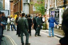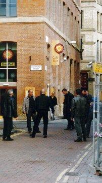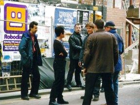 | Watching just out of the range of the camera, backs to the brick wall that delineates the Rochdale Canal, is a small cross-section of Manchester's population, who have taken advantage of the break for lunch to wander down Canal Street to see what all the commotion is about. This location shoot has not been publicised - in fact, everything about today has been very cloak and dagger, with last minute directions and instructions being sent by fax only a day or two before, and tomorrow's Call Sheets being distributed one by one from a well-guarded cardboard box. (In fact, tomorrow the cast and crew will be at Manchester Airport and it will be in the papers -- the sight of Sean Bean running down a glass-walled connecting tunnel firing off a gun is not something the everyday traveller quite expects to encounter on his or her way through the terminal.) |