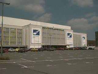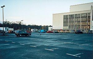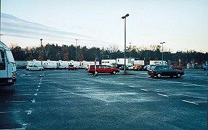 The parking lot of the Deutschlandhalle, showing cast and crew trailers and vehicles from the production. (Sean's trailer is the first on the left in the row along the far end of the parking lot.)