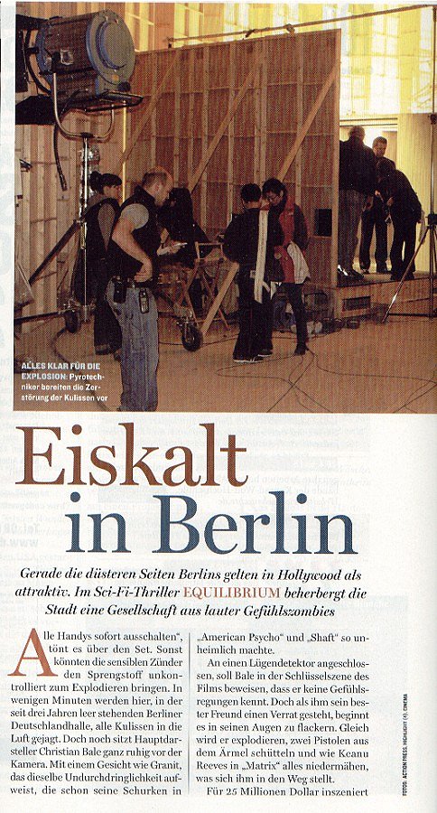the "Turn off all mobile phones" is announced on the set. Otherwise one of the sensitive fuses could bring the demolition charge to an untimely explosion. In a few minutes, all backdrops will be blown into pieces here in the Berliner Deutschlandhalle, which has been out of use for three years. Right now, leading actor Christian Bale sits calmly in front of the camera, with a face resembling granite, and an impenetrability that has made his baddies in "American Psycho" and "Shaft" so sinister. In the key scene of the movie, he is wired to a lie-detector that should prove that he has no emotions. But when his best friend confesses treachery, his eyes begin to move. In a second, he will burst out, reveal two guns that were hidden in his sleeves, and like Keanu Reeves in "Matrix" will gun down everyone and everything that will cross his way. |