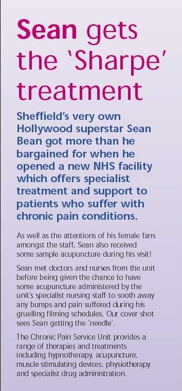 Source: Sean visited the NGH on Saturday, 31 August 2002, at around 2 pm to officially open the Chronic Pain Service facility, located in the courtyard behind the old nurses home. Sean met staff and received some acupuncture, then had the chance to relax when he sampled some hypnotherapy, before officially opening the unit and staying around for a photo and autograph session. Please visit the Sheffield Teaching Hospitals and the Link Newsletter. |
