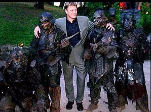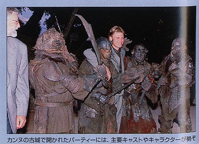 British actor Sean Bean (c) as Boromir in the film "The Lord of the Rings", directed by New Zealand's director/writer/producer Peter Jackson, poses with performers dressed as orcs for the party at the hill-top Chateau Castellaras, during the 54th Cannes Film Festival, 13 May 2001. AFP PHOTO GERARD JULIEN Agence France Presse, 05-13-2001. |