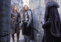 The plight of Eowyn (Miranda Otto), Eomer's sister, deepens as she sings a mournful dirge during Theodred's funeral. Meanwhile, her unrequited passion for visiting warrior Aragorn (Viggo Mortensen) is further inflamed when he tames an unruly horse by whispering sweet nothings in Elvish.
