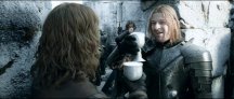 Jackson injects much fun with food and beverage. Eowyn, not especially deft in the kitchen, serves Aragorn a vile-looking bowl of homemade stew, which he politely chokes down. Boromir and Faramir share a couple of victory brews, and one declares in beer-ad fashion, "Today, life is good." Pippin and Merry greedily guzzle the magical elixir known as Ent-draught, adding inches to their wee stature.