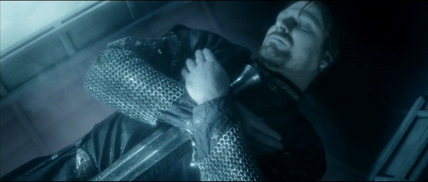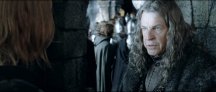 Rohan horseman Eomer (Karl Urban) finds his mortally wounded cousin Theodred and brings him home, where his subsequent death goes all but unnoticed by his spell-stunned father, King Theoden (Bernard Hill).
