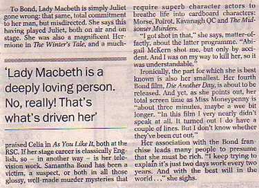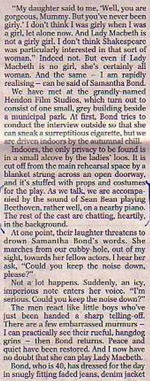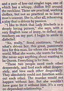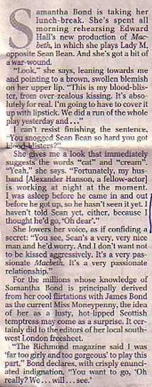 Samantha Bond has given herself blisters playing Lady Macbeth, and she's still only in rehearsal. She outs the damned spot with David Thomas.