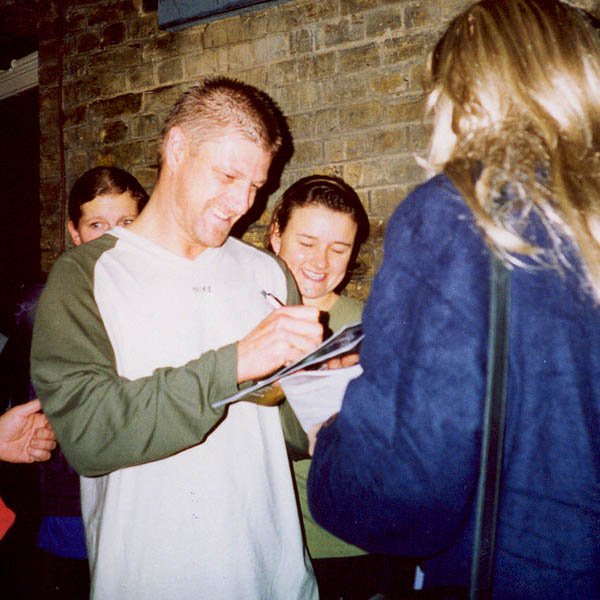 The play started off with a thin gauze black curtain hanging in front of the stage, and the three wierd sisters materializing off the ground behind it to dance around the fire. Very cool. Then the battle starts, and suddenly... there's Sean! First thought was, it's Sharpe meets Sean Miller. A tough black mesh/net top, brown sleeveless long leather coat, sword in hand... Here's where my review breaks down... Wow. Very wow. The entire production, from the great sound/lighting, to the fights, the acting, etc etc just had a great feeling of uneasiness, always being on edge. Sean and Samantha were amazing, and Julian Glover totally impressed me as well. They spoke their lines not only as if they had always talked that way, but really feeling them. Wonderful delivery, perfect diction.
