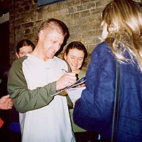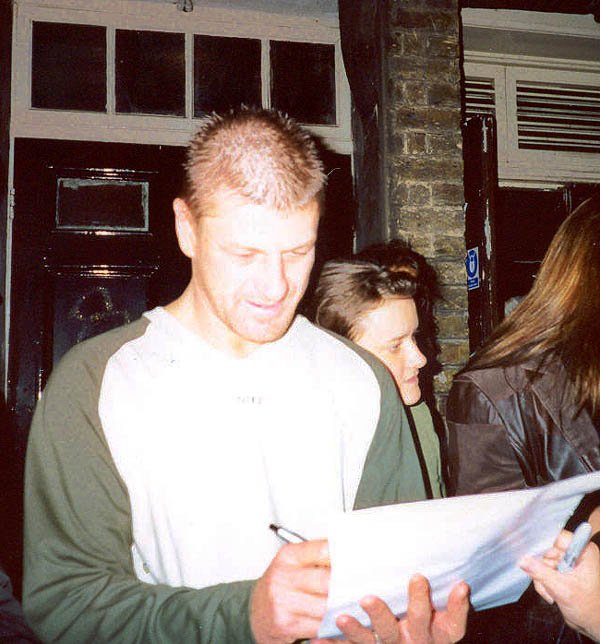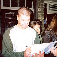 Sean had on the black mesh top for a lot of the play, combined with different leather pants and jackets. At one point, the wierd sisters visited him in his bedroom, and he was shirtless for the entire scene (with the sisters seductively moving all around him). He normally has a very lean build, but obviously he's been working out his upper body... after the play, I was next to a group of British teenagers on our way out the door, one of whom (a guy) blurted out to his friend, "Dude, Sean Bean is STACKED!" That was just too funny!!
