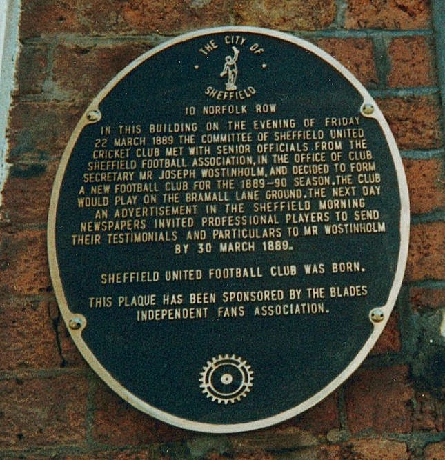 What the plaque says: The City of Sheffield In this building on the evening of 22 March 1889 the Committee of Sheffield United Cricket Club met with senior officials from the Sheffield Football Association. in the office of Club Secretary Mr Joseph Wostinholm, and decided to form a new football club for the 1889-90 season. The club would play on the Bramall Lane ground. The next day an advertisement in the Sheffield morning newspapers invited professional players to send their testimonials and particulars to Mr Wostinholm by 30 March 1889. Sheffield United Football Club was born. This plaque has been sponsored by the Blades Independent Fans Association. |