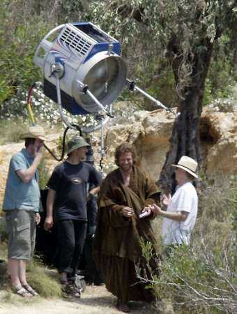 (wearing hat and white shirt) during a break in filming of Troy at Ghajn Tuffieha Bay, in the north of Malta, May 13, 2003. Source: REUTERS/Darrin Zammit Lupi |