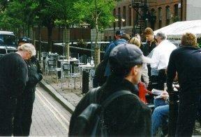 So what is Extremely Dangerous all about? Judging by this morning's action, it's about Sean Bean, wearing green overalls, a purple shirt and workboots, fiddling about with some electrical wiring under the road, then sauntering over to an outdoor café to have a word with Ron Donachie, who is sitting at a table having a quiet drink. Which is where the Range Rover with the spotless windshield comes in. As Sean's character (Neil Byrne) and Donachie's character (Gebbert) chat, the Range Rover drives ominously down the road towards them. Gebbert utters a threat: "You're a dead man, Byrne!" - then gets up and walks away. The Range Rover screeches to a stop. A number of evil looking men leap out, only to be dispatched by Sean - a car door slammed in the face of one, a wine bottle shattered over the head of another. It is, as films go, one very long scene, and an extremely technical one at that. Timing is everything. |