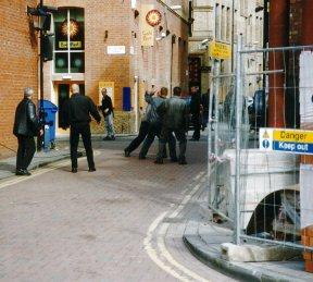 | Watching just out of the range of the camera, backs to the brick wall that delineates the Rochdale Canal, is a small cross-section of Manchester's population, who have taken advantage of the break for lunch to wander down Canal Street to see what all the commotion is about. This location shoot has not been publicised - in fact, everything about today has been very cloak and dagger, with last minute directions and instructions being sent by fax only a day or two before, and tomorrow's Call Sheets being distributed one by one from a well-guarded cardboard box. (In fact, tomorrow the cast and crew will be at Manchester Airport and it will be in the papers -- the sight of Sean Bean running down a glass-walled connecting tunnel firing off a gun is not something the everyday traveller quite expects to encounter on his or her way through the terminal.) |