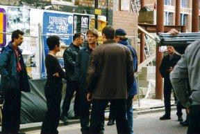 Today's spectators are by and large curious office workers who inhabit the general vicinity of the Manchester's gay district, which we are smack in the middle of. But because the action is moving away from Canal Street and off into a smaller, darker side road, the security at both ends has been relaxed. People stroll down the street on their way to the pub, stop at the elevated camera tracks and peer around the corner. "Right," says one beaming woman, hurrying back to her boyfriend after a brief glimpse. "I've seen HIM. Now I'm happy!" Behind us, assorted crew members discuss the actors. "Are those our police or their police?" one of them wonders, curiously, as two uniformed extras from Cops on the Box help themselves to the free coffee on a table outside the pub. Beside us, the makeup ladies are discussing how they will approach the subject of adding a realistic looking cut to Sean's arm once the fight scenes involving the iron pipes have been shot. They have the tools of their trade packed into carry-bags which have been parked in a "safe area" beside the black canvas chair with SEAN BEAN written across its back in red script. They've already added a painful-looking contusion to the head of the actor who was smashed with the wine bottle before lunch. Their blood, Julie notes, comes in one litre bottles, carries a French label, and costs £12. |
